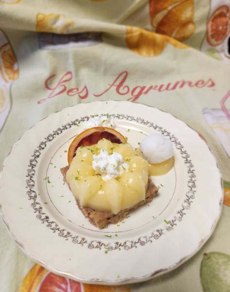 Le dessert est servi avec une boule de glace au citron, qui intensifie encore les arômes et ajoute une touche glacée bienvenue, surtout lors des chaudes journées d’été. Le tout est parsemé de zestes de citron vert, qui viennent réveiller les papilles et donner une finition colorée et parfumée à l’assiette.